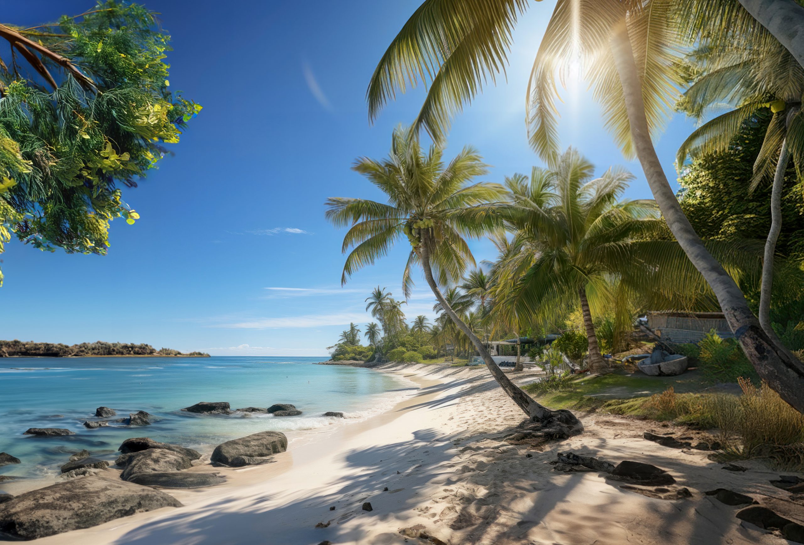 תמונה אופקית של חופש (יש גם גרסה אנכית). חוף קסום עם דקלים מתנשאים, חול זהוב ומים צלולים בגוון טורקיז תחת שמיים כחולים ובהירים. התמונה ניתנת להורדה בחינם ומתאימה להדפסה כפוסטר או על קנבס, ומביאה תחושת רוגע ושלווה לכל חלל.