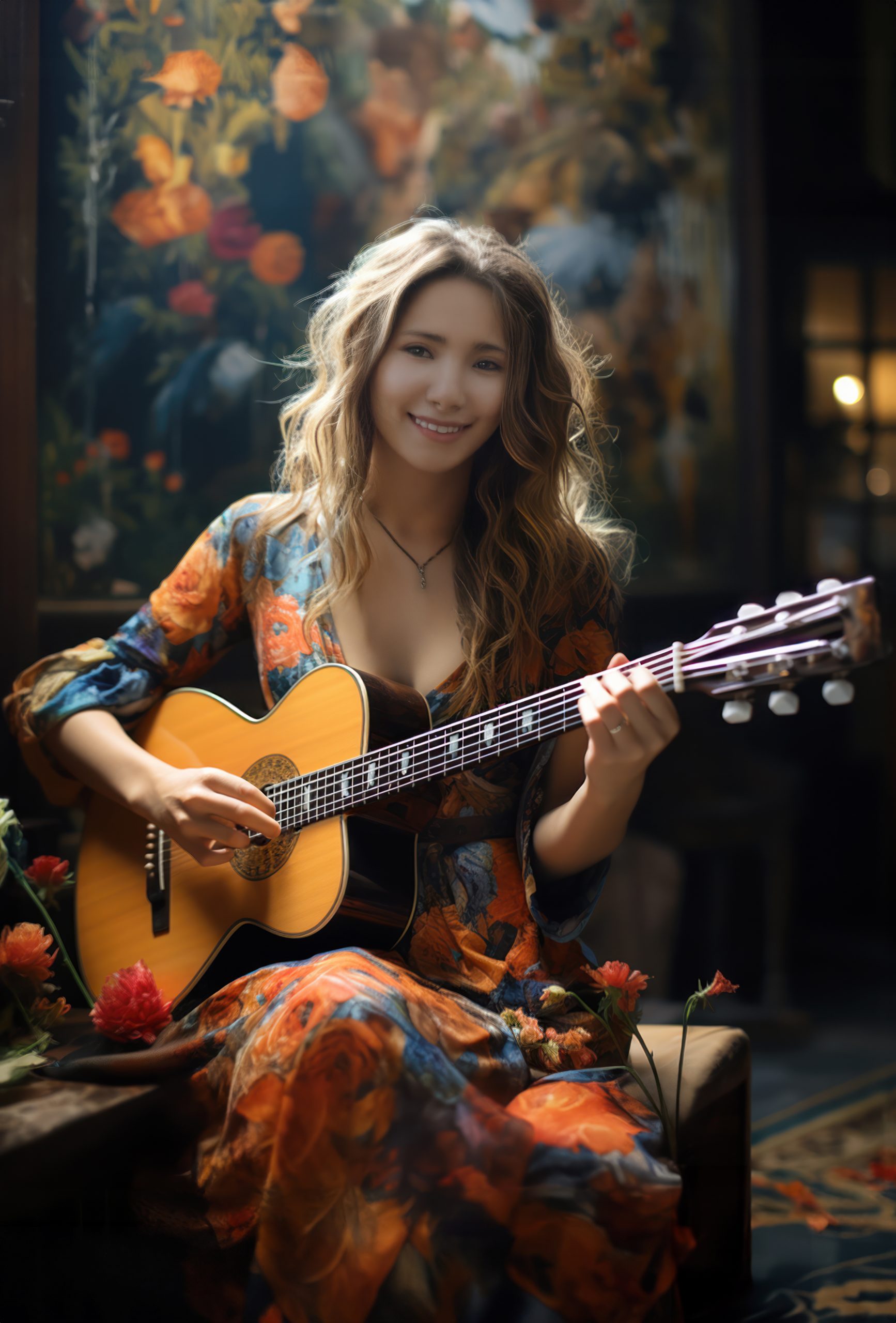תמונה יפהפייה המציגה אישה יפה מנגנת בגיטרה, לבושה בשמלה צבעונית עם דוגמאות פרחים, ברקע ציור אמנותי. התמונה מעבירה תחושה של שמחת חיים, יצירתיות ואווירה נעימה. ניתנת להורדה בחינם להדפסה כפוסטר או על קנבס.