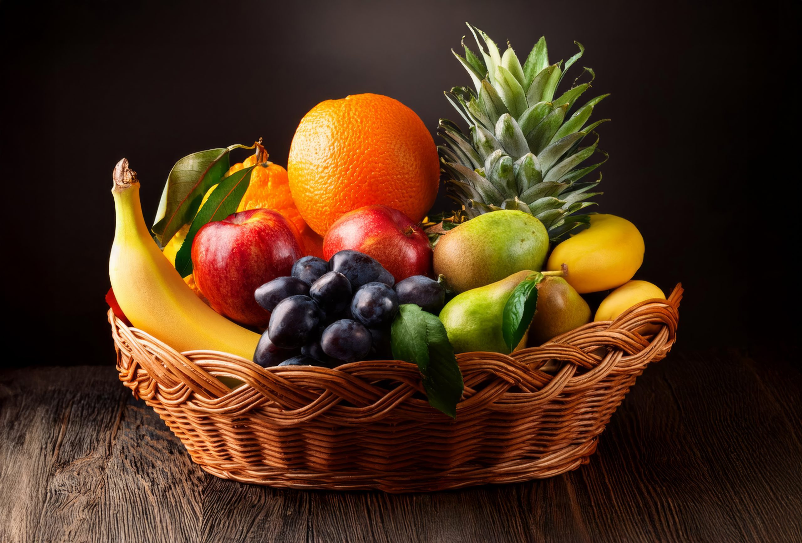 סל פירות עשיר ומגוון הכולל אננס, תפוז, בננה, ענבים, אגסים ותפוחים. הצבעים הרעננים והחזקים של הפירות יוצרים תחושת בריאות, טריות וחיוניות. אידיאלי להוספת חן טבעי וחמים לחלל.
