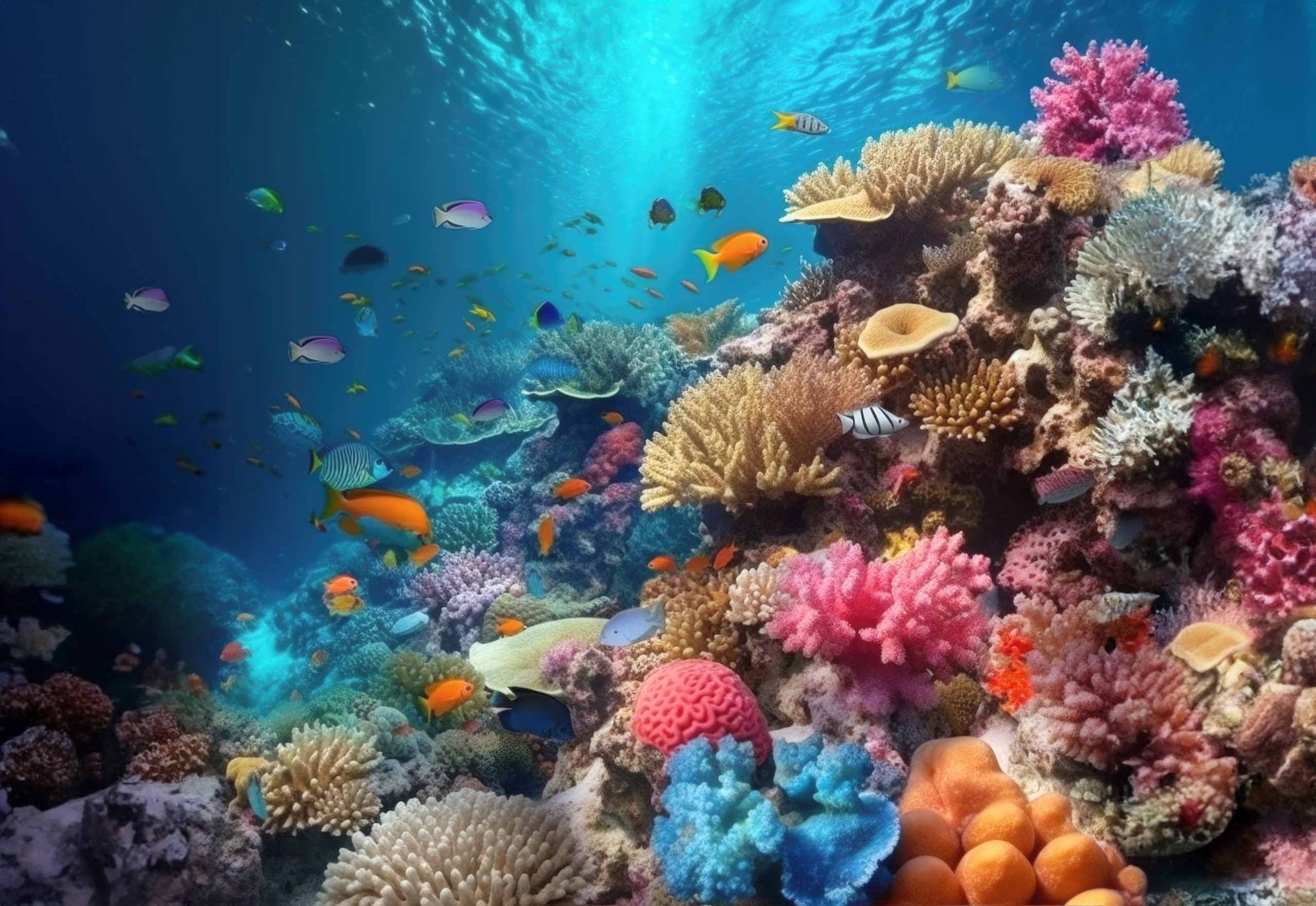 עולם תת-מימי של צבעים. תמונה עוצרת נשימה המציגה שונית אלמוגים עשירה בצבעים תוססים וצלילות מדהימה של מי הים. בתמונה מופיעים דגים צבעוניים ואלמוגים שונים, המספרים סיפור ייחודי של החיים התת-מימיים, המתאימים לכל חלל שמחפש להכניס תחושת טבע והרמוניה.